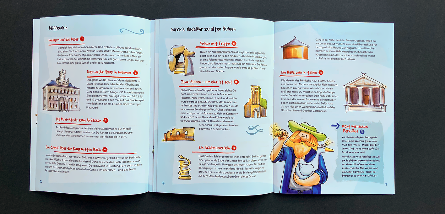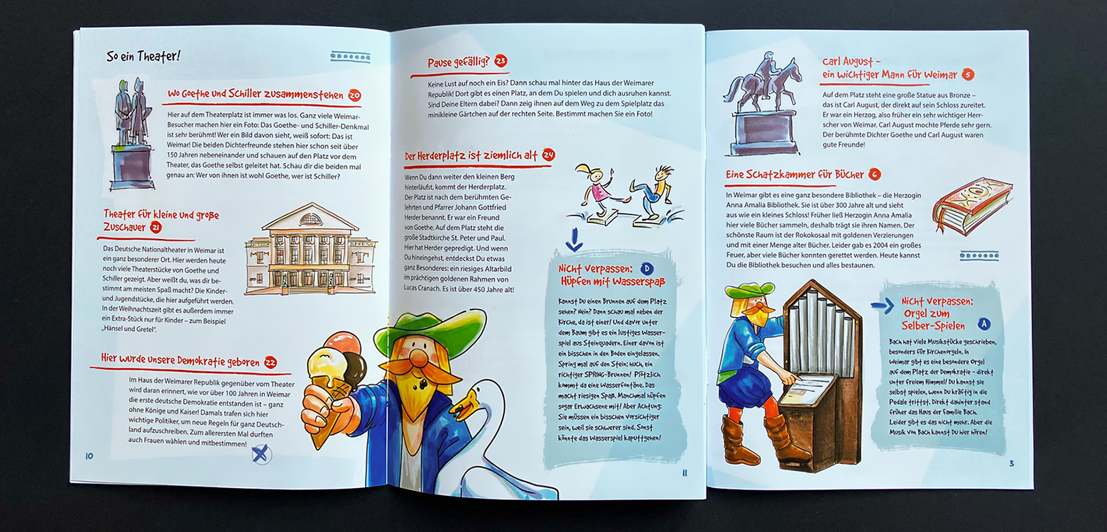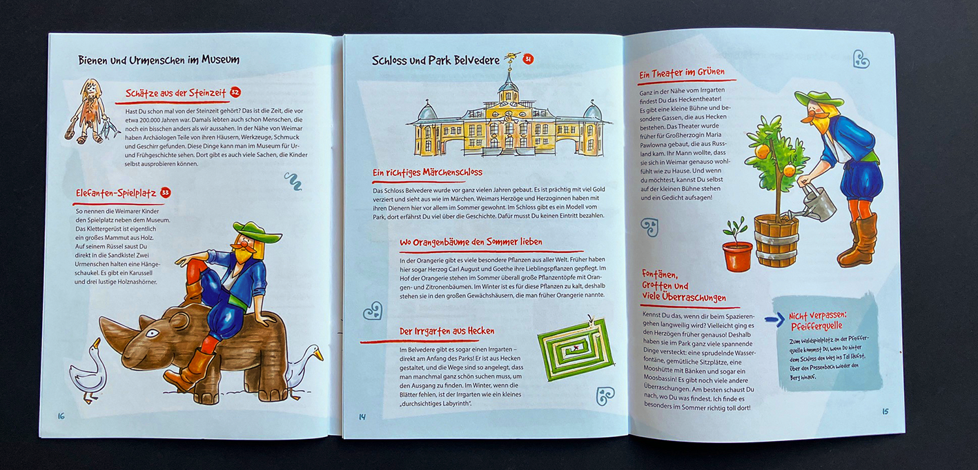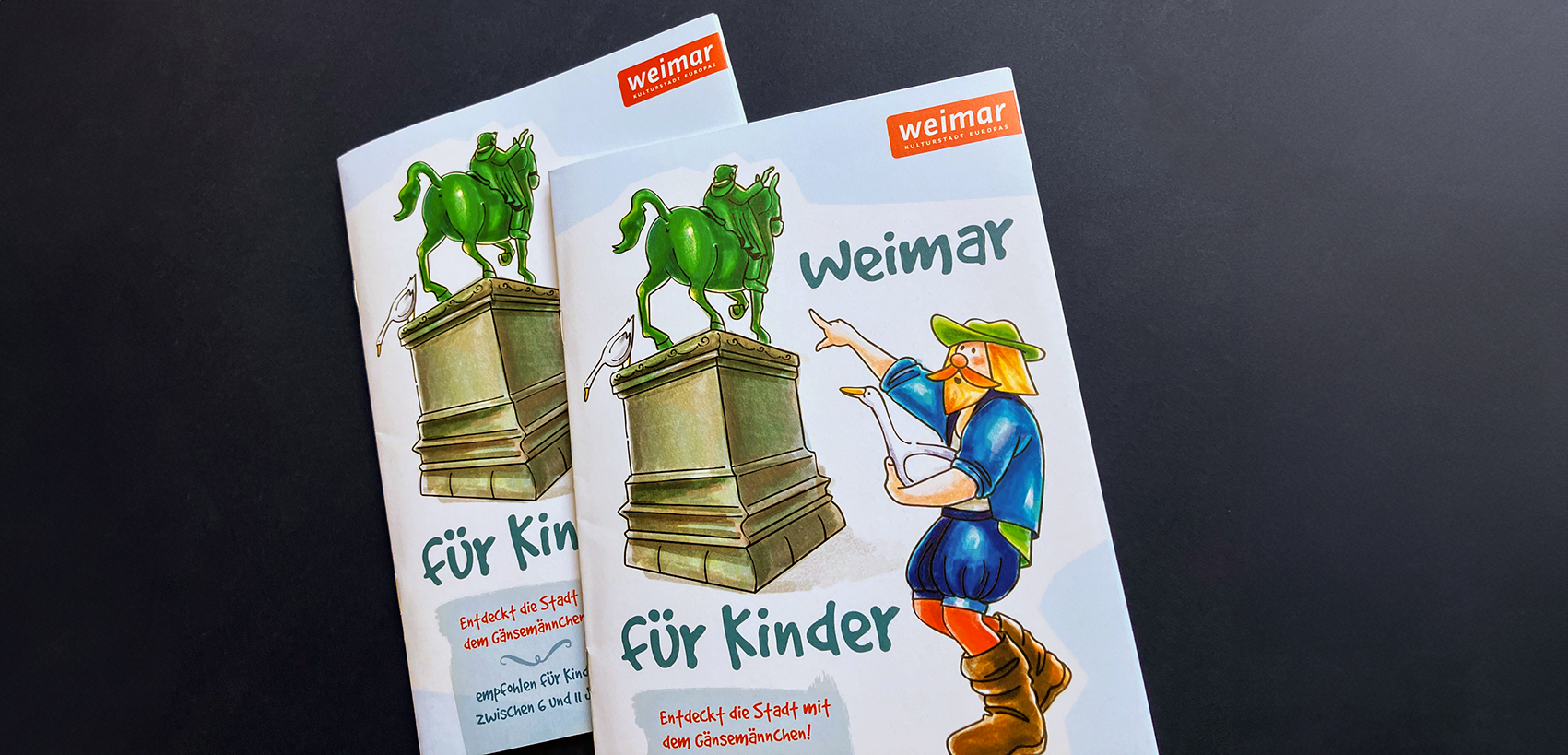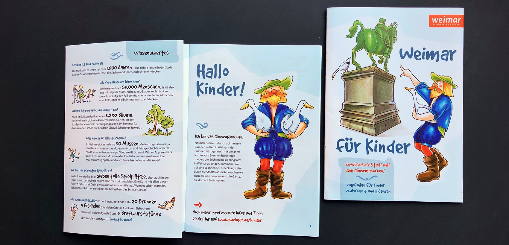 Es gibt wieder eine Broschüre "Weimar für Kinder": der Inhalt ist frisch; Format, Layout und Illustrationen haben wir neu gestaltet. Das Gänsemännchen steigt vom Sockel und führt Kinder durch die Stadt: Interessant für Gäste, aber auch Weimarer Kinder zur Info über Neues in der Stadt und Freizeitangebote. Erhältlich in der Tourist-Information am Markt.